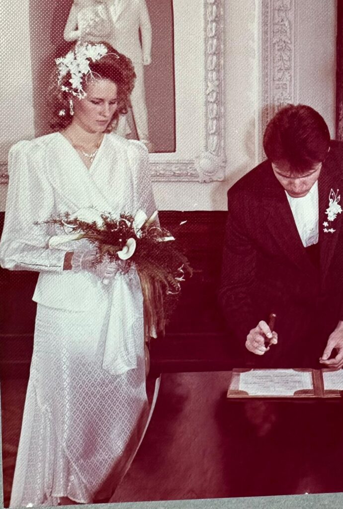 Gintautė vestuvių dieną, 1990-ųjų rugsėjo 13-ąją, puošėsi išrinktojo jai įteikta suknele. Pieno baltumo audinį pora tuomet įsigijo Gariūnuose, prie Vilniaus.