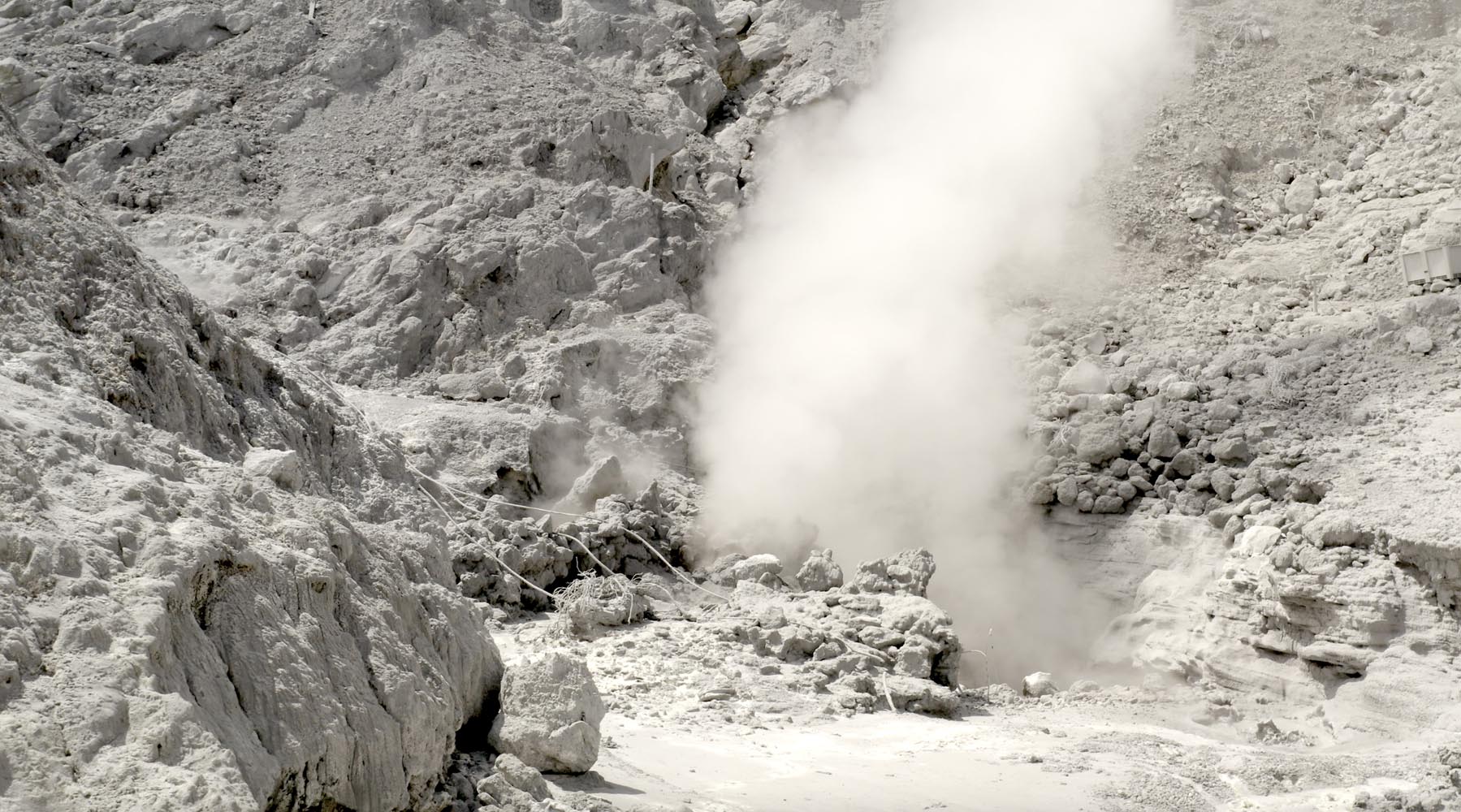 Videodarbas „Šokantys peizažai, vulkaninis kvėpavimas“ yra platesnio meninio tyrimo projekto dalis, orientuota į Pietų Italijoje esantį supervulkaną, žinomą kaip Flegrėjos laukai (Campi Flegrei). Dėl vykstančios seisminės krizės ši vulkaninė kaldera, kurioje gyvena daugiau nei pusė milijono žmonių, patiria lėtą žemės paviršiaus pakilimą ir nusėdimą, kurį lydi seisminė veikla.