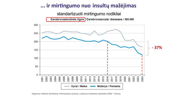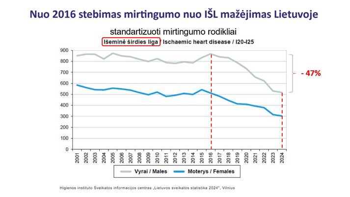 „Šie mirtingumo rodikliai Lietuvoje mažėja nuo 2016 metų. Per šį laikotarpį matomas akivaizdus standartizuoto mirtingumo sumažėjimas nuo išeminės širdies ligos – 47 proc. tarp vyrų ir 45 proc. tarp moterų, o nuo insulto – 37 proc. tarp abiejų lyčių. Pagrindinės mirtingumo mažėjimo priežastys – geresnė kraujotakos ligų prevencija, pažangesnis gydymas ir rizikos veiksnių korekcija bei augantis šalies pragyvenimo lygis“, – teigia ji.