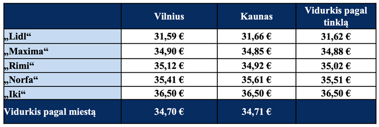 Palyginus sausio 15 d. tyrimo metu nupirktų prekių krepšelių kainų vidurkius paaiškėjo, kad prekybos tinkle „Lidl“ jis siekė 31,62 euro, „Maxima“ – 34,88 euro, „,Rimi“ – 35,02 euro, „Norfa“ – 35,51 euro, o „Iki“ – 36,50 euro.