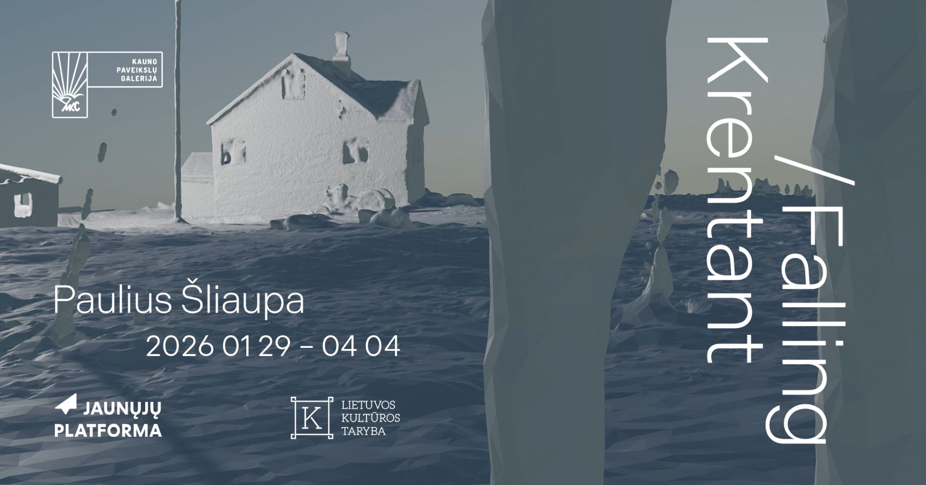 „Krentant“ – tai paroda, kurioje kritimas suvokiamas ne kaip žlugimas, o kaip jautrus ryšio su peizažu būdas. Filmuose, instaliacijose ir tapyboje Paulius Šliaupa tyrinėja gamtos jėgas kaip tylius procesus. Jie formuoja mūsų jutimus ir atmintį skirtinguose kraštovaizdžiuose.
