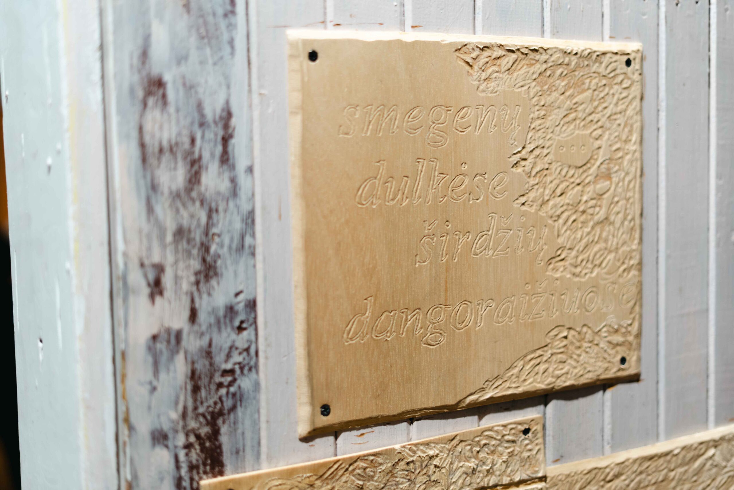 pritvirtino išraižytas faneros lenteles, kurios veikia ne tik kaip vizualus elementas, bet ir papildomas